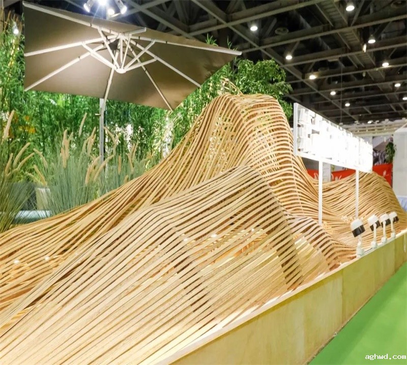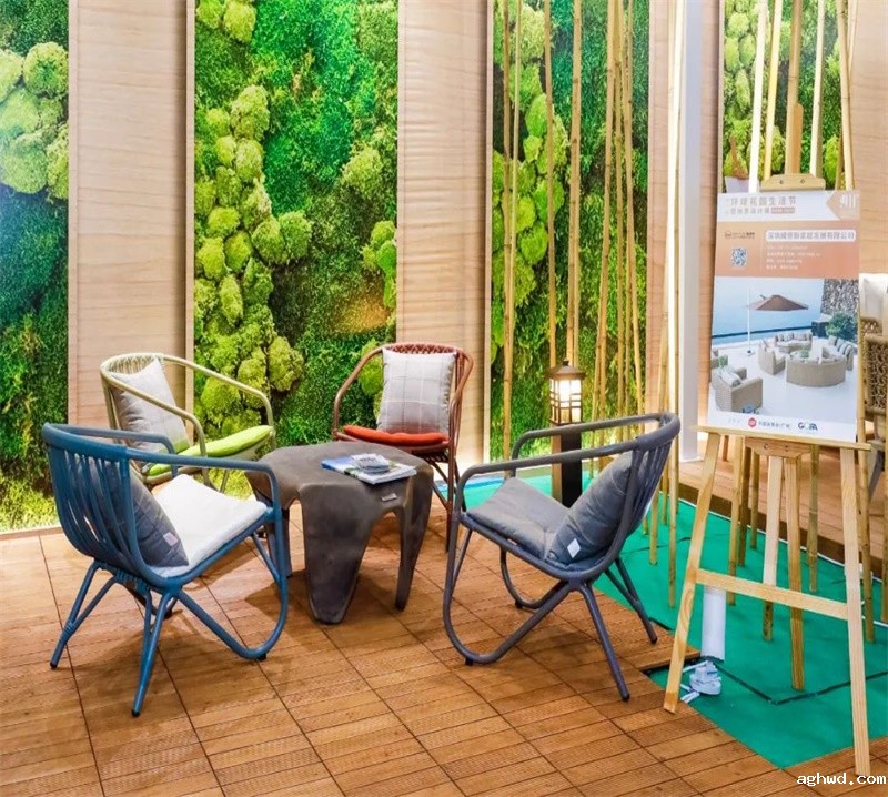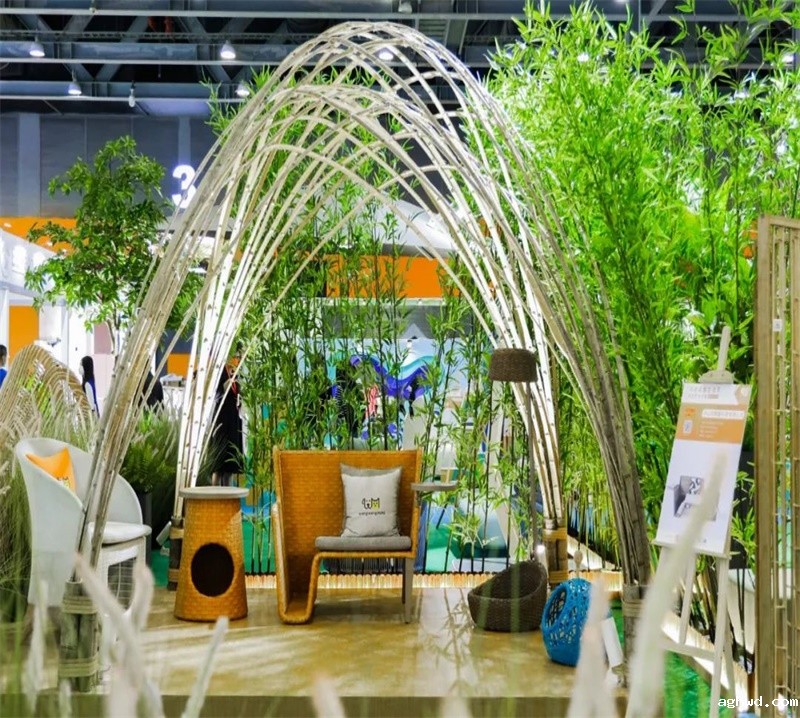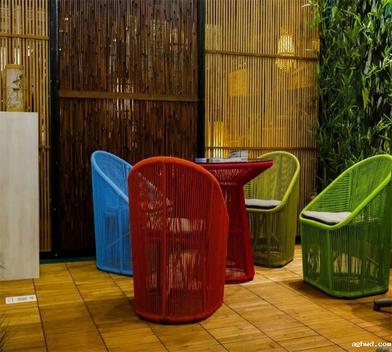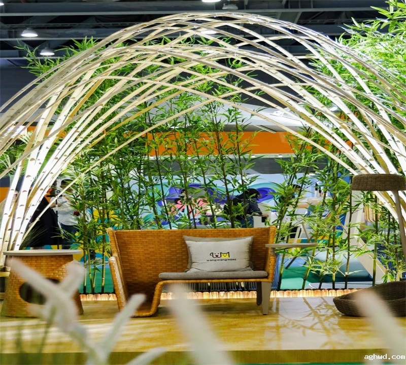 荣泰开发的仿竹片藤被用作装修材料,装点展会入口,让观众全面了解户外家具行业最前沿产品以及最新的趋势变化的同时,感受到户外材料的可塑性和运用面的广泛性。