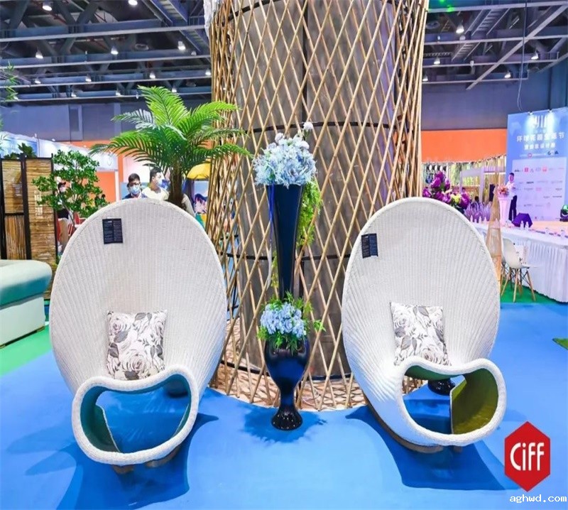 美居藤带来的编工精细的贝壳产品以及现代简约的软装户外家具,为现场增光溢彩。